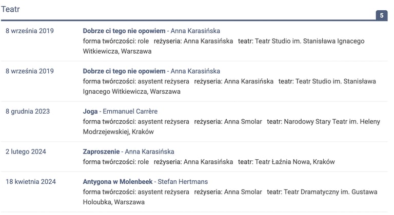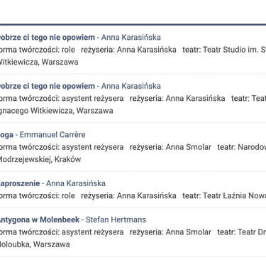 Ukończyła studium fotograficzne w Akademii Fotografii w Warszawie oraz kształciła się na kierunku kultura współczesna na Uniwersytecie SWPS. Brała udział w Laboratorium Nowoczesnych Praktyk Teatralnych, a także ukończyła kurs aktorski i reżyserski w Lart Studio w Krakowie oraz roczny kurs reżyserski w Speakers Avenue w Warszawie. Posiada również ukończony kurs „Praca z osobą w żałobie: nowe perspektywy”, realizowany w Instytucie Dobrej Śmierci, oraz kształcenie w zakresie reżyserii filmowej w Warszawskiej Szkole Filmowej. Aktualnie pracuje nad swoją pierwszą książką.